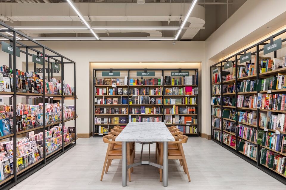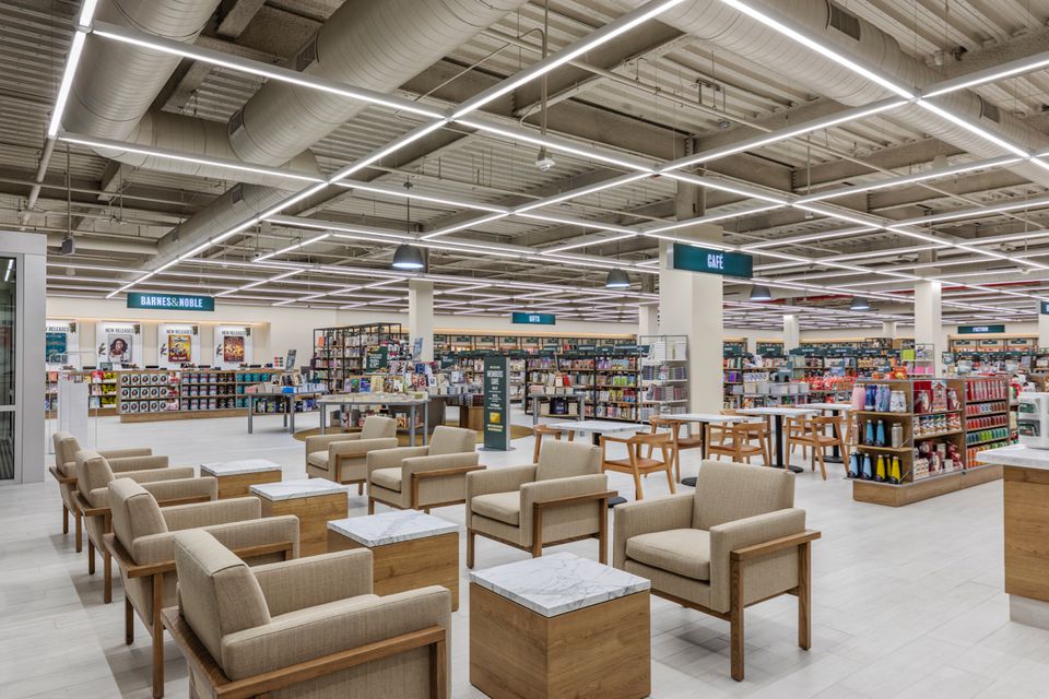Description: The 20,114-square-foot store features modern design aesthetics, including oak bookshelves and wood grain tile floors throughout. Lower profile bookshelves will provide customers with a panoramic view of the store, contributing to an open and airy feel. Two large “book theaters” invite customers to discover books in a new 360-degree experience. Illuminated bookcases are incorporated into the store, to further enhance discovery. Construction elements include: