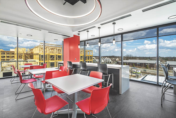 - Custom lunch room and pantry with modern lighting and views.