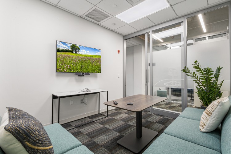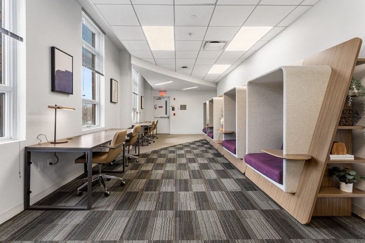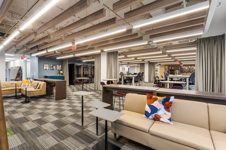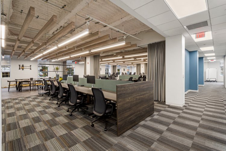 This project features a new reception lobby, kitchenette, restrooms, nursing suite, wellness rooms, offices and open concept work stations throughout. This space also includes open ceiling reception and work areas with acoustical baffles hung throughout.