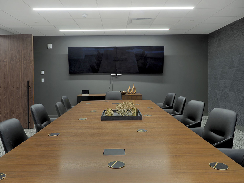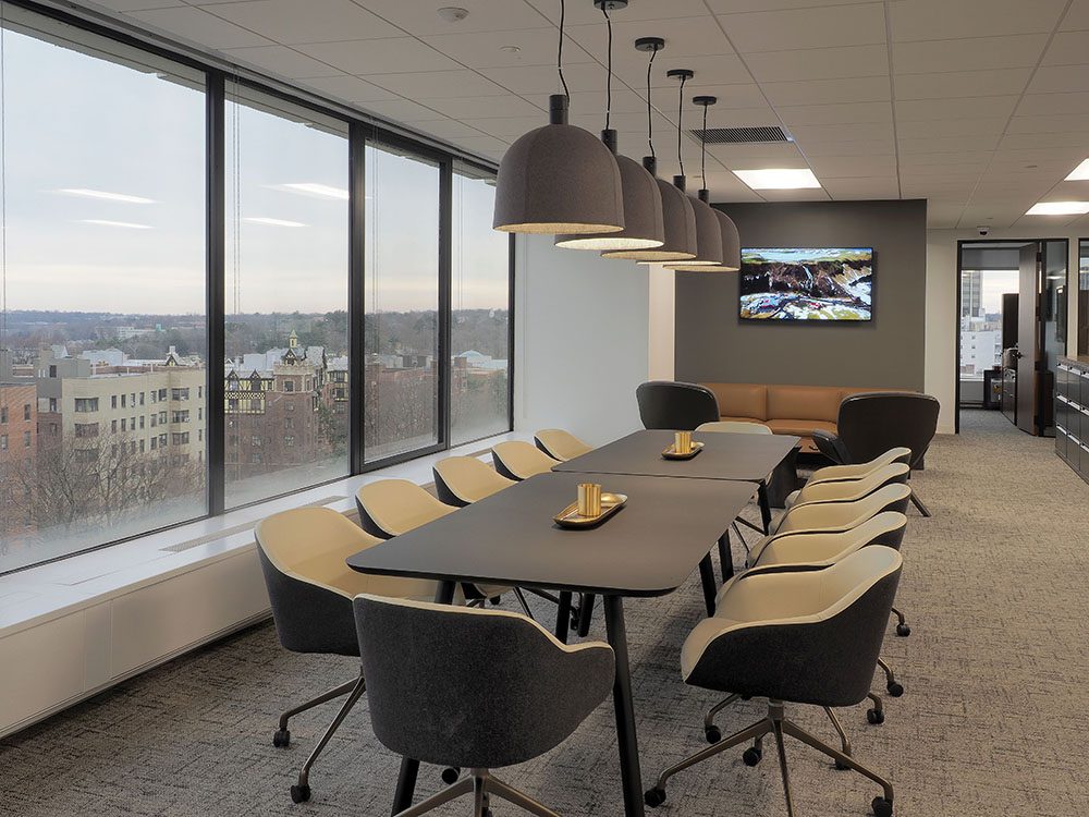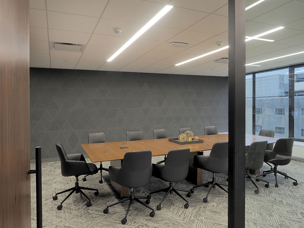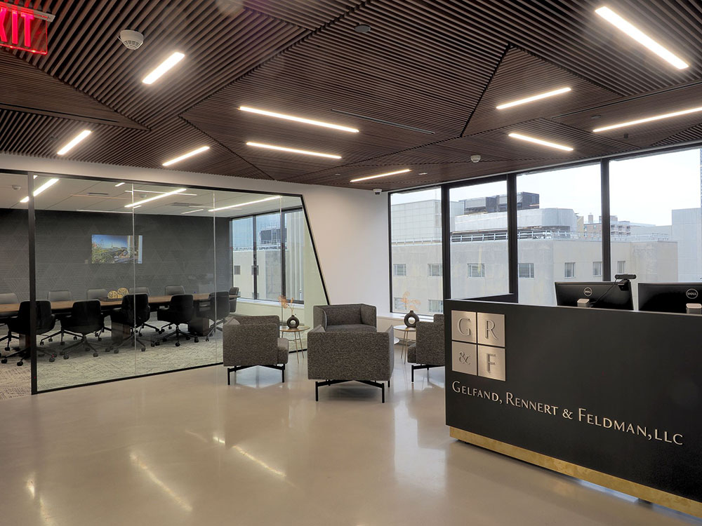 Description: This 10,000 sf Gelfand office space , was a full office renovation consisting of a polished concrete reception area with a custom wood plank ceiling. The scope of work also included tag system for offices, conference rooms and updated kitchen space.