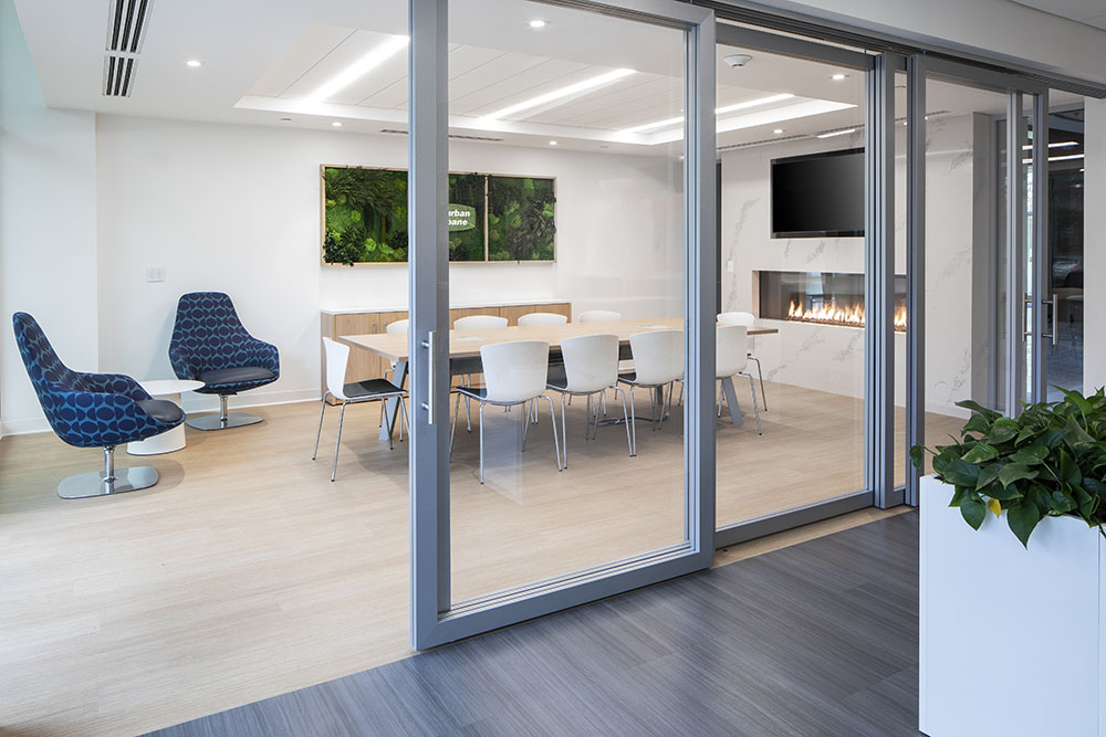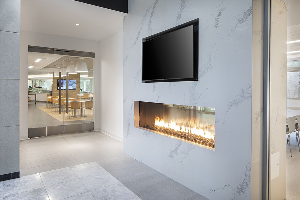 - New fireplace with double open face clad on quartz stone at meeting room with new glass sliding doors