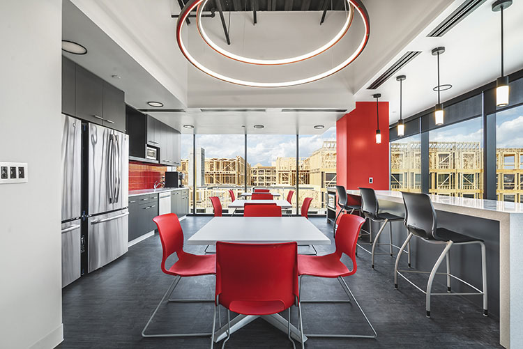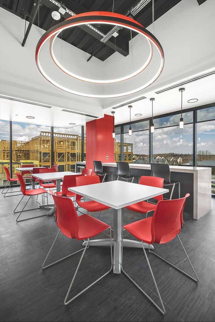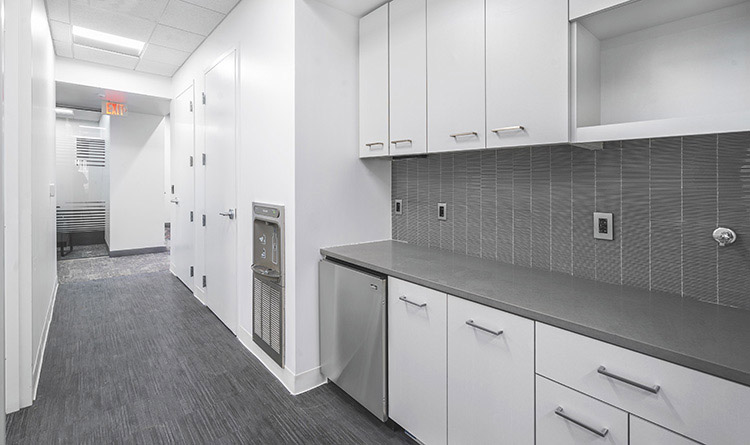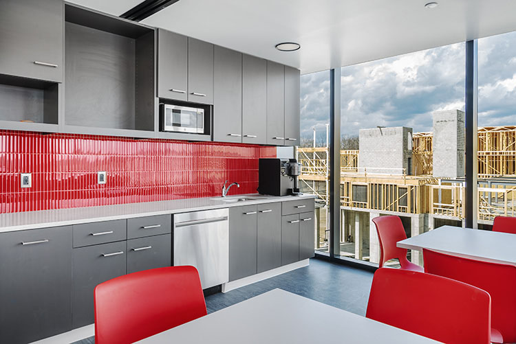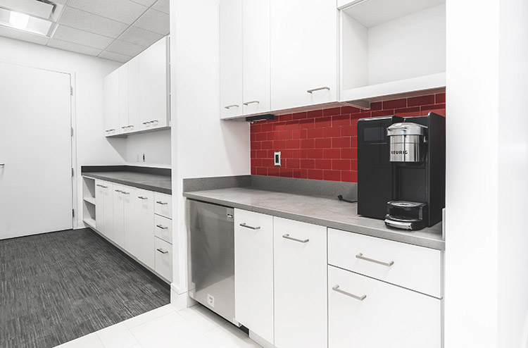 - Custom lunch room and pantry with modern lighting and views.