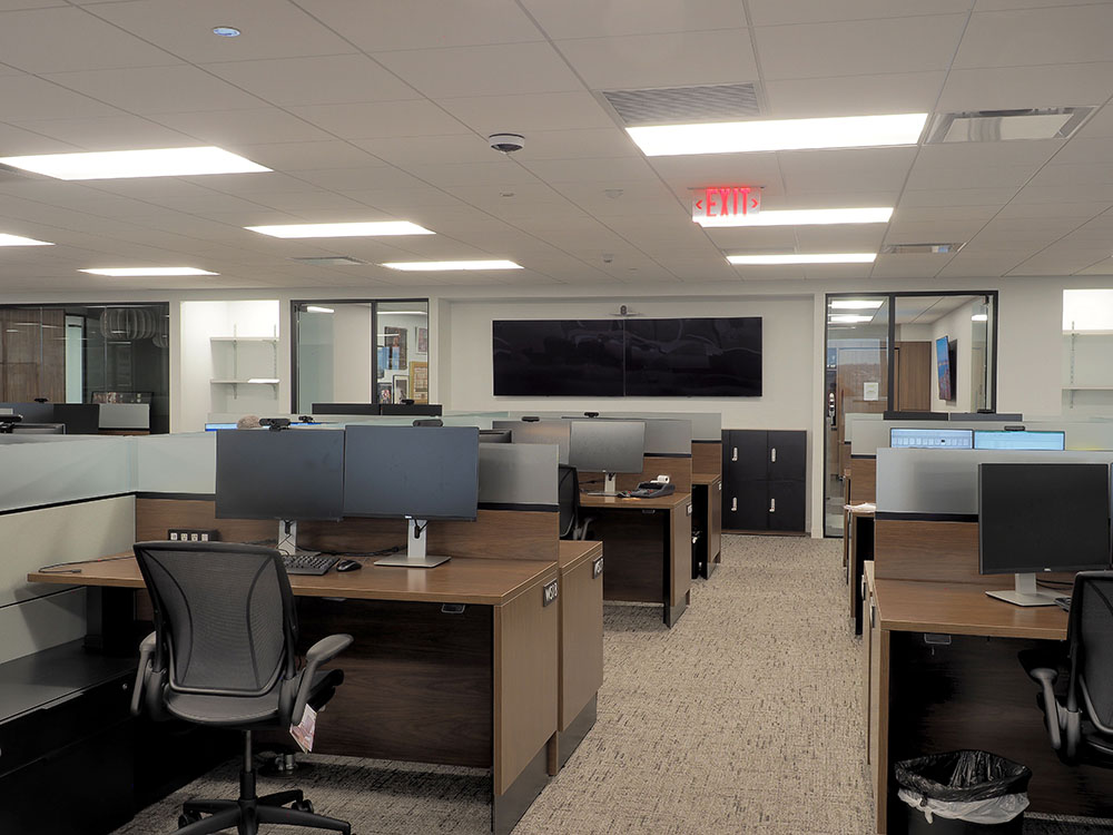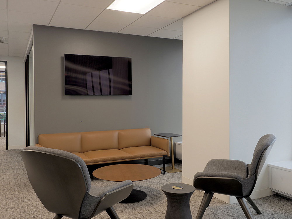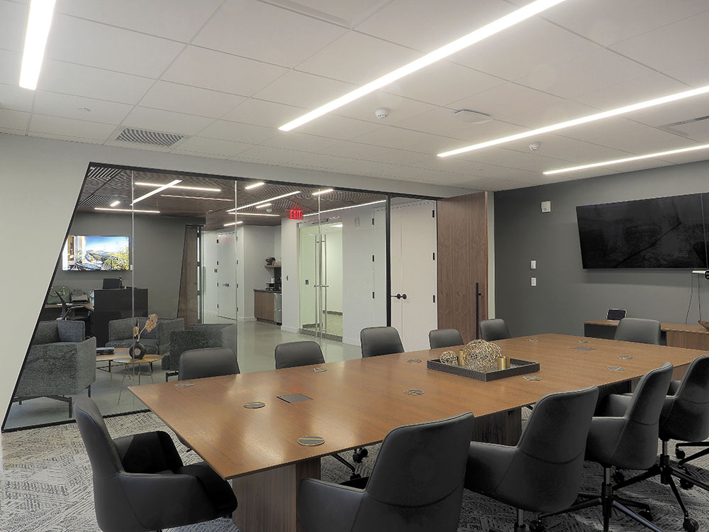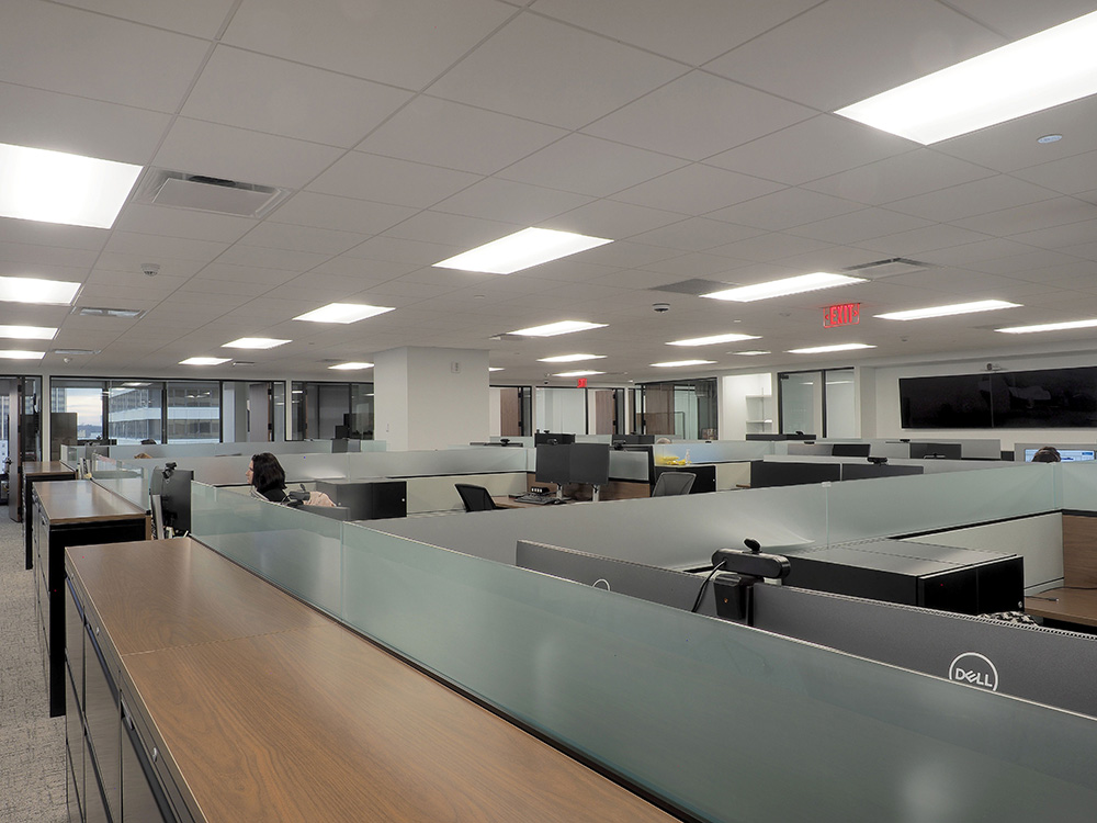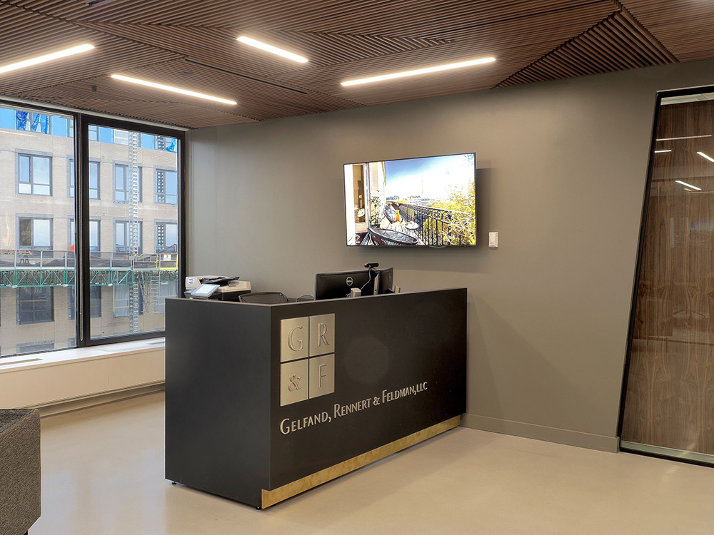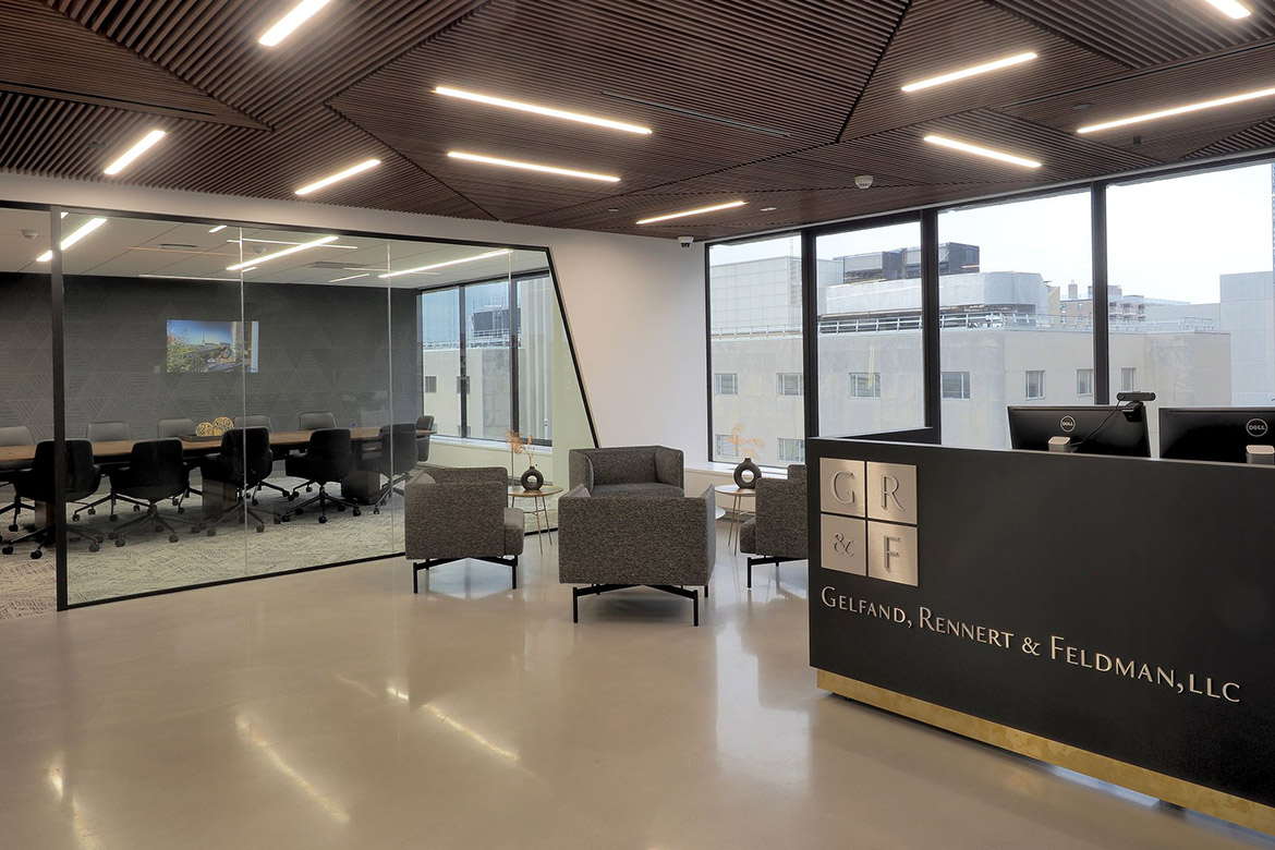 Description: This 10,000 sf Gelfand office space , was a full office renovation consisting of a polished concrete reception area with a custom wood plank ceiling. The scope of work also included tag system for offices, conference rooms and updated kitchen space.